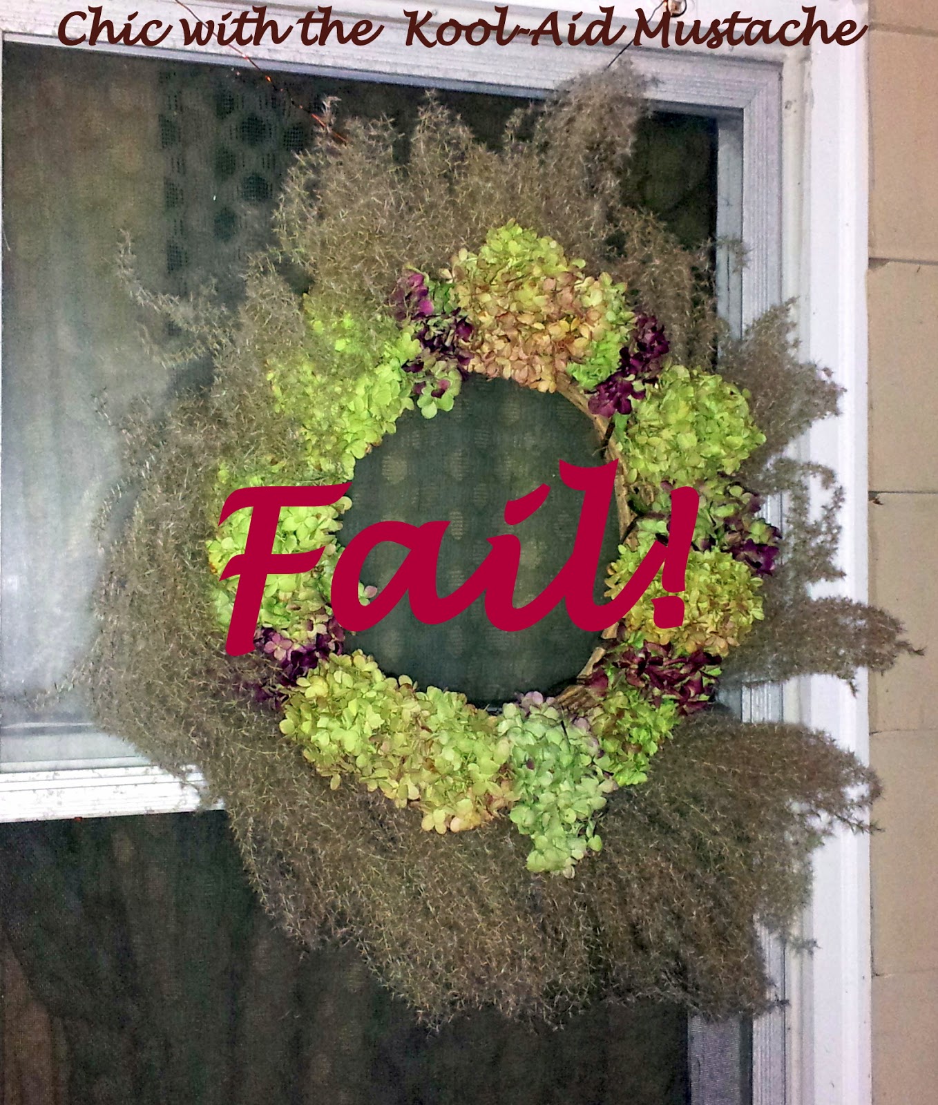 I hung it temporarily on the door to the man-cave because I thought the hunter green would show off the beautiful color of the flowers and it looked good. I wasn't completely taken with my wreath, I have a 'thing' about spacial issues and the fact that my spiraled grass seed sprigs (fronds?) aren't evenly spaced would eventually drive me nuts.